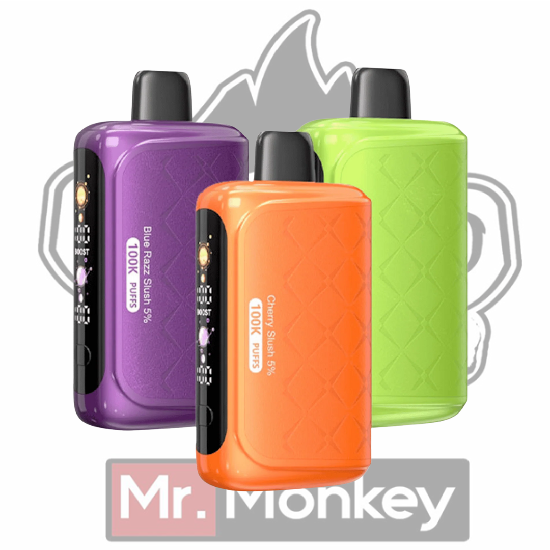 Un desechable de gran capacidad que promete hasta 100,000 puffs. Probablemente equipado con depósito extra grande y batería recargable, pensado para usuarios de alto consumo que desean olvidarse de recargas frecuentes.