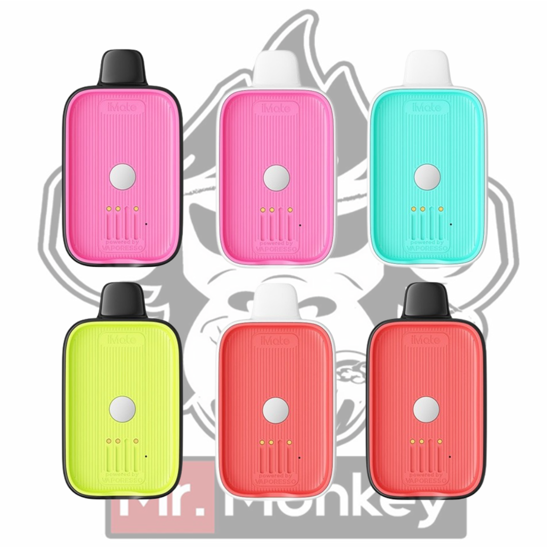 Kit desechable recargable de Vaporesso con hasta 20,000 puffs. Incluye batería de larga duración, cartucho intercambiable y diseño ergonómico. Parte de la serie iMate, que se enfoca en comodidad y durabilidad.